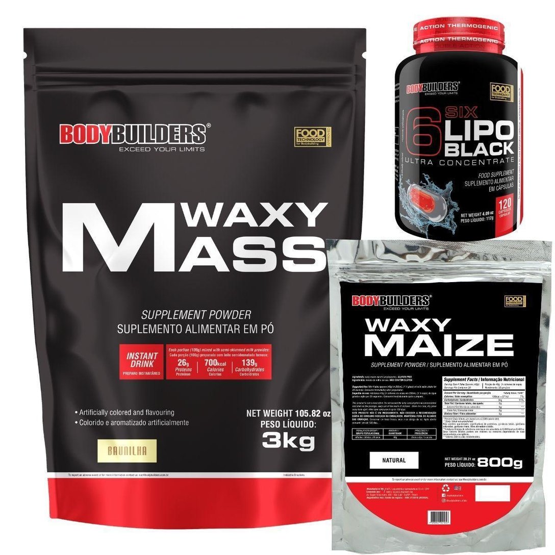 - Nome: Waxy mass 3kg+Waxy Maize 800g+Six 6 lipo black 120 cáps - Bodybuilders